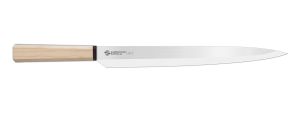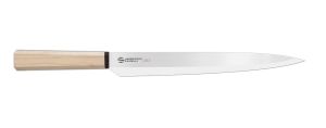 Questa tipologia di affilatura è ideale per realizzare un taglio lungo e progressivo, nello specifico per affettare finemente e filettare il pesce. Il manico esagonale garantisce una presa confortevole ed è realizzato in legno di acero e faggio termotrattato in corrispondenza del codolo.